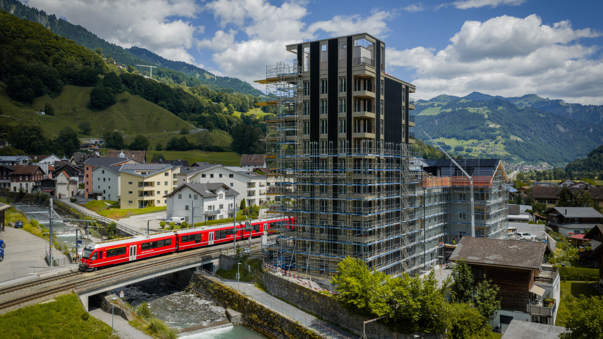 Wo einst Mühlräder klapperten, summen heute Photovoltaik-Module an der Fassade des 33 Meter hohen Siloturms, der einst mit Getreide gefüllt war. Mit dem Projekt Mühle Grüsch ist in direkter Bahnhofsnähe eine wegweisende Liegenschaft mit 52 Wohnungen entstanden, die ökologisch, sozial und architektonisch auf die Zukunft ausgerichtet ist. Es ist ein Leuchtturmprojekt für nachhaltiges Bauen und zugleich eine Blaupause für eine neue Form der Zusammenarbeit in der Bauwirtschaft. Hinter dem Projekt steht die 2021 von der Zindel AG und der Schumacher Beteiligungen AG gegründete Gutgrün AG. Als Architekturbüro waren wir für die Entwicklung und Umsetzung verantwortlich und konnten unsere langjährige Erfahrung mit nachhaltigen Bauprozessen einbringen.