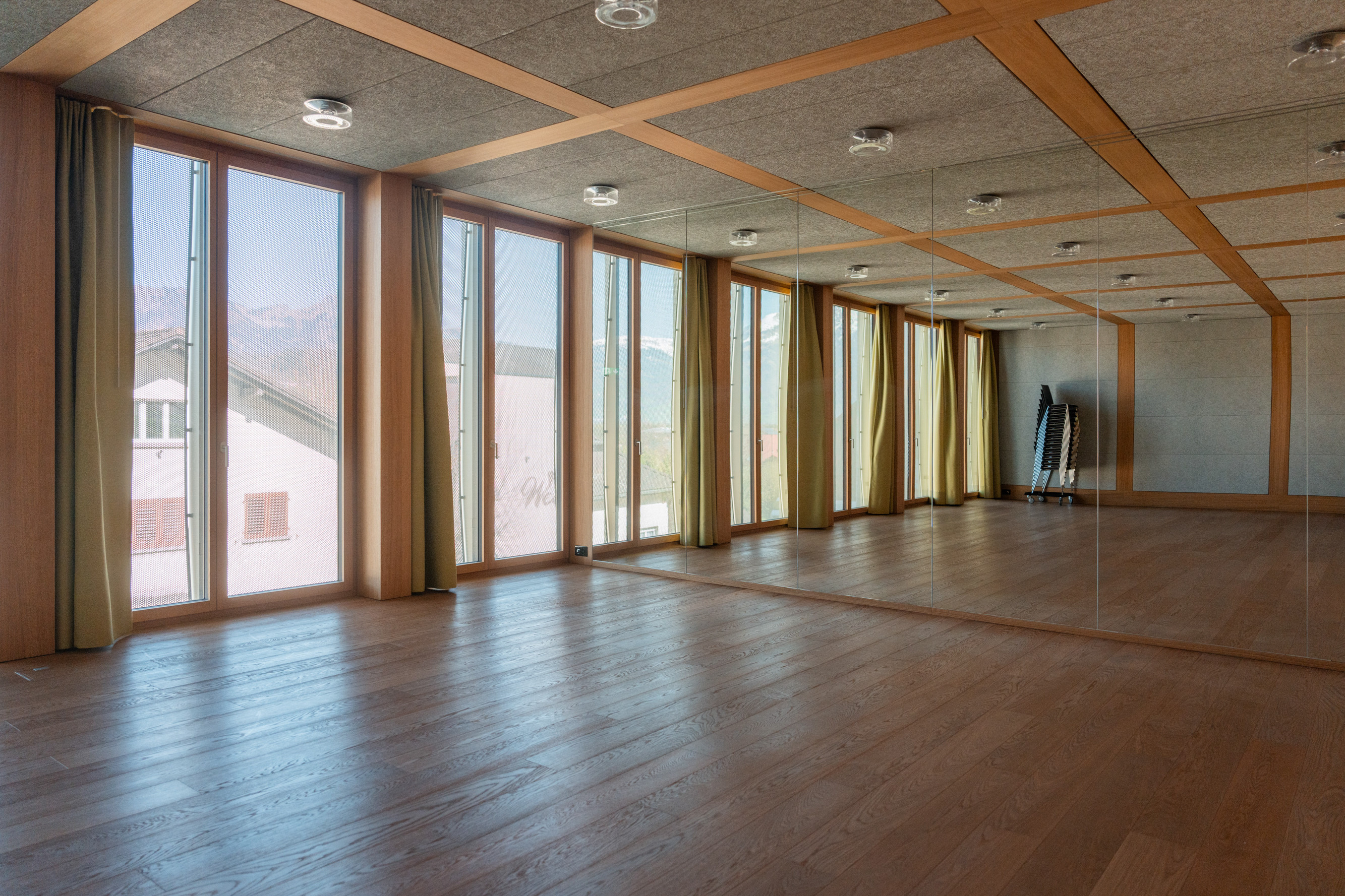 In Resonanz zu leben, heisst auch mitzuschwingen. Die geschwungenen Lochbleche der Gebäudehülle nehmen den «Ton» von Nendeln in Form einer Sinuskurve auf und halten das Gebäude – zusammen mit der kleinteiligen Fassadenstruktur – im dörflichen Massstab. Der Aussenbereich verzichtet aus diesem Grund auf einheitlichen Bodenbelag. Er zeigt sich vielmehr differenziert und spiegelt damit die kleingliedrige Baustruktur des Ortskerns.